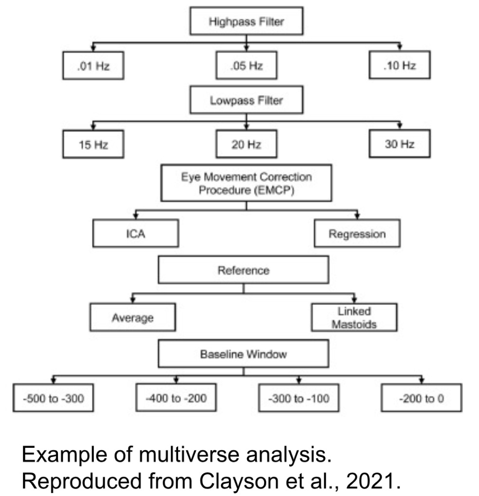 In research, a multiverse analysis refers to exploring multiple analytical scenarios for the same dataset. Instead of committing to a single method of analysis, researchers explore a range of different analytical choices to understand how these choices affect the study's outcomes. This approach acknowledges that different analytical paths can lead to different results, and it aims to provide a more comprehensive view of the data. For example, is it better to high-pass filter the data at 0.1 Hz or 0.5 Hz (see figure).